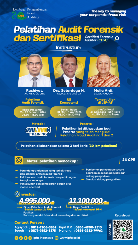 Lembaga Pengembangan Fraud Auditing (LPFA) menyelenggarakan Diklat Audit Forensik dalam rangka Sertifikasi Certified Forensic Auditor…