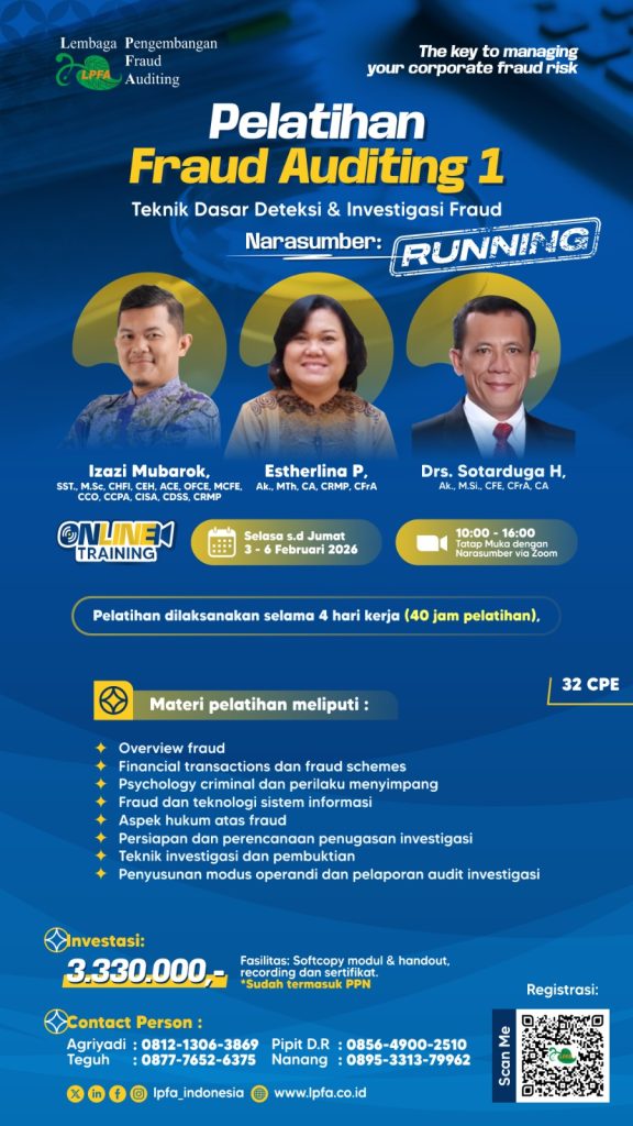 Ikuti pelatihan fraud auditing lanjutan yang berfokus pada studi kasus dan simulasi praktik. Pelatihan ditujukan untuk meningkatkan kemampuan mendeteksi, menangani, dan mengungkap fraud dengan teknik praktis.” Pelatihan dirancang untuk pemenuhan portfolio bagi mereka yang akan mengambil sertifikasi profesi CFrA