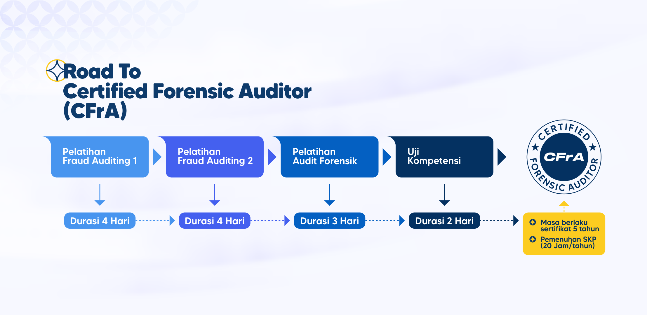 Adapun tahapan pelatihan yang harus diikuti sebelum uji kompetensi Sertifikasi Auditor Forensik (Certified Forensic Auditor) adalah sebagai berikut :